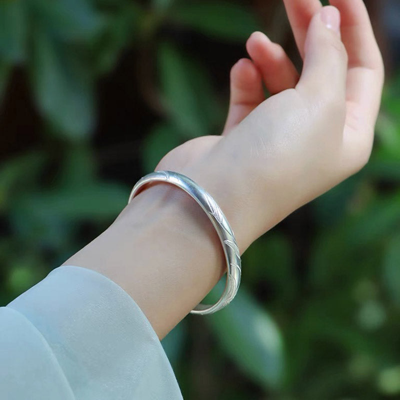 This hand-carved vintage Chinese bamboo leaf pattern on a pure solid silver bangle bracelet exudes a minimalist and Zen-like charm, reflecting the essence of natural cultural aesthetics.