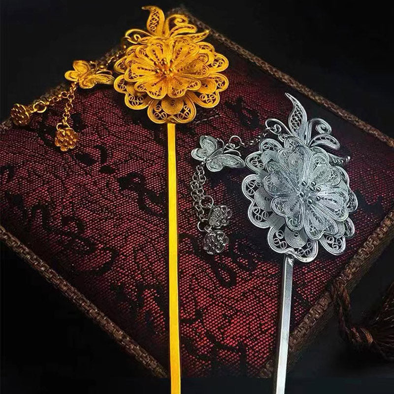Épingle à cheveux en filigrane à double fleur en argent sterling 999 de style chinois vintage fabriquée à la main avec pompon papillon et bourgeons