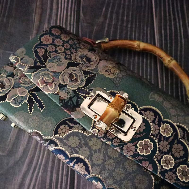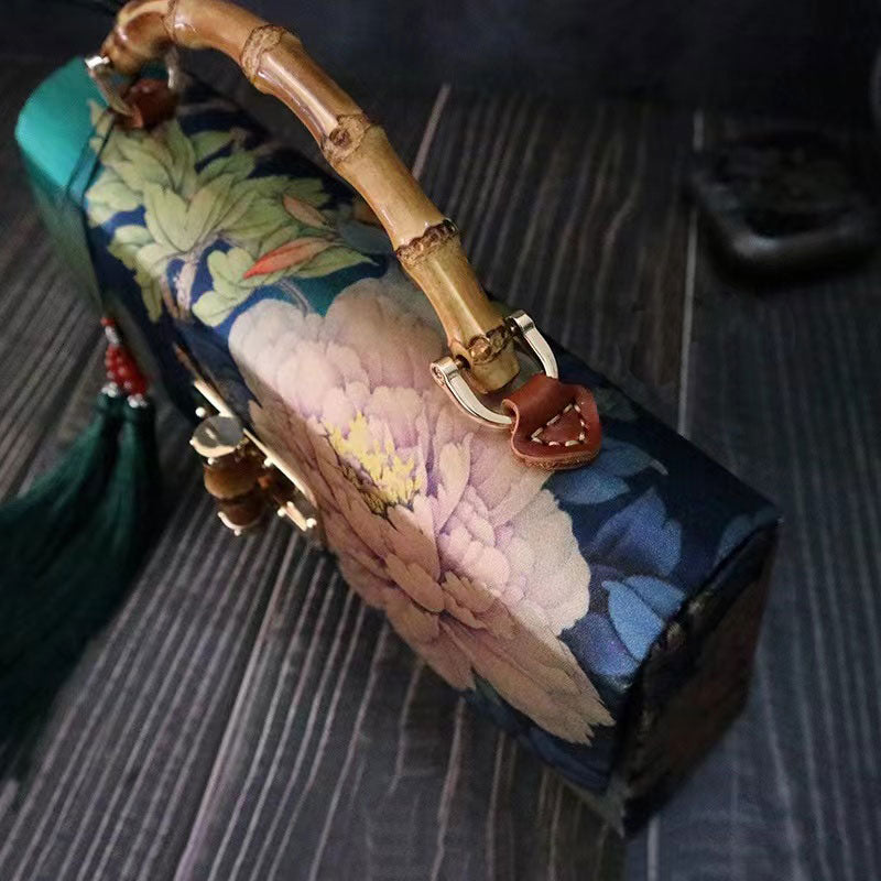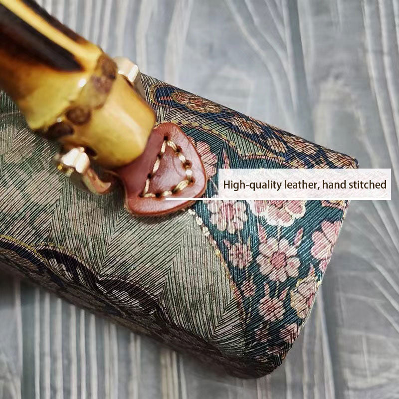 • Nom : pochette vintage en soie avec poignée en bambou et imprimé floral pour femme.
