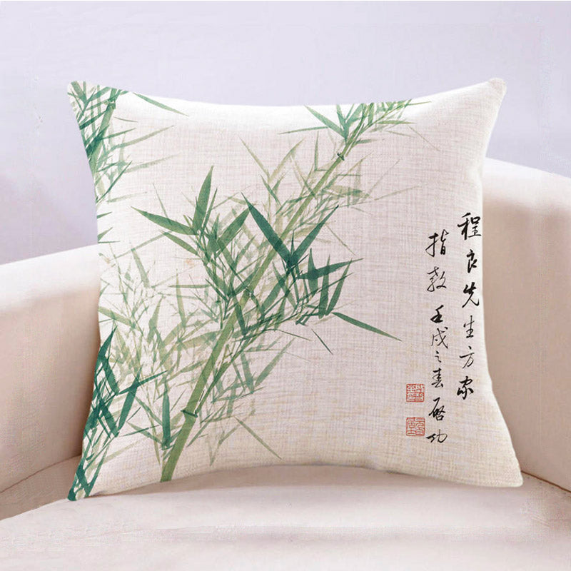 Vintage Chinese Style Ink Bamboo Leaf Landscape Painting Cotton and Linen Throw Pillow